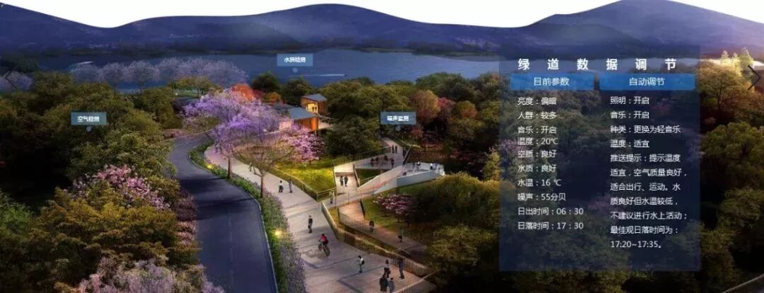这里再给大家介绍一下绿道的环境数据智能采集,系统通过智能传感器可24小时全天候对环境中各项关键要素,如温度、PM2.5、风速风向、光照等进行监测传输,并同步深圳气象台气象数据,发布运动出行指数供游客参考,这样刮风下雨也能提前知道啦~