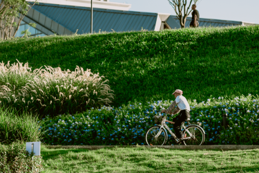 在市民花田田间挺立着无数七彩绚丽的风车,迎风转动。原本是为驱赶鸟儿的风车,变成了花田的又一趣味景观。