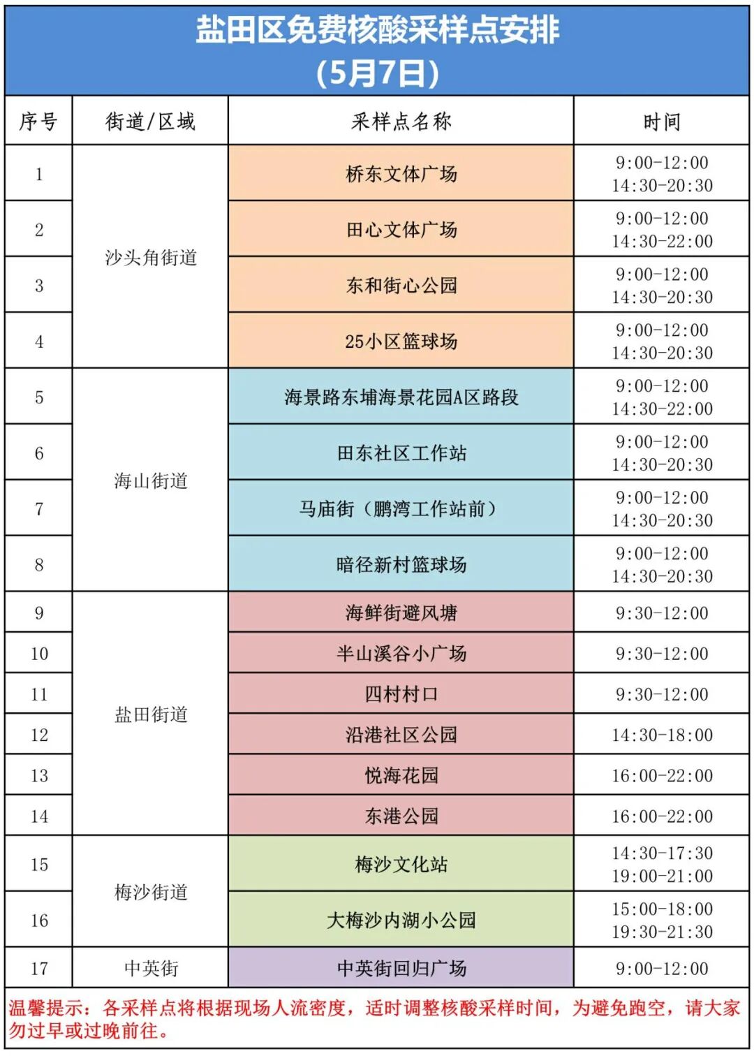 盐田区5月7日核酸采样点安排