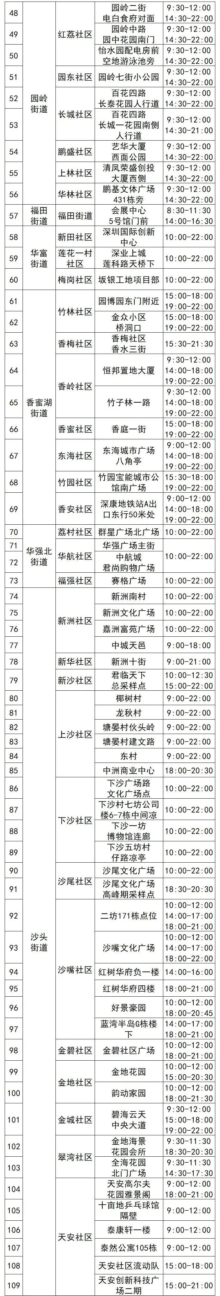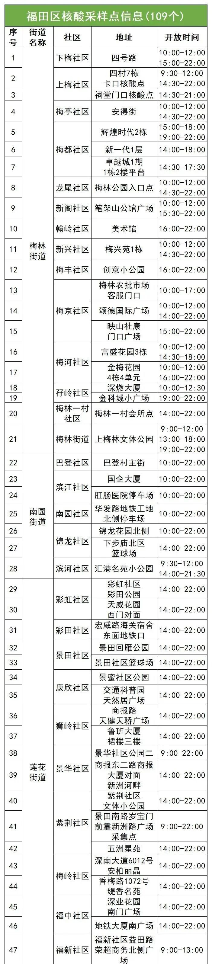 为方便居民进行核酸检测,5月7日,福田区设置109个对外公开的免费核酸检测采样点,为居民提供服务。 温馨提示 需要注意是,因社区小区、城中村实行“居民白名单制”管理,免费核酸检测采样点名单及检测时间具体以各街道部署为准,请市民持续关注。 街道社区防疫工作根据现场人流密度,适时调整核酸采样时间,为避免跑空,请大家勿过早或过晚前往,切忌踩点。 以上核酸检测点位数据来源于官微每日发布,可能会不开放或者临时调整,以点位现场实际情况为准。