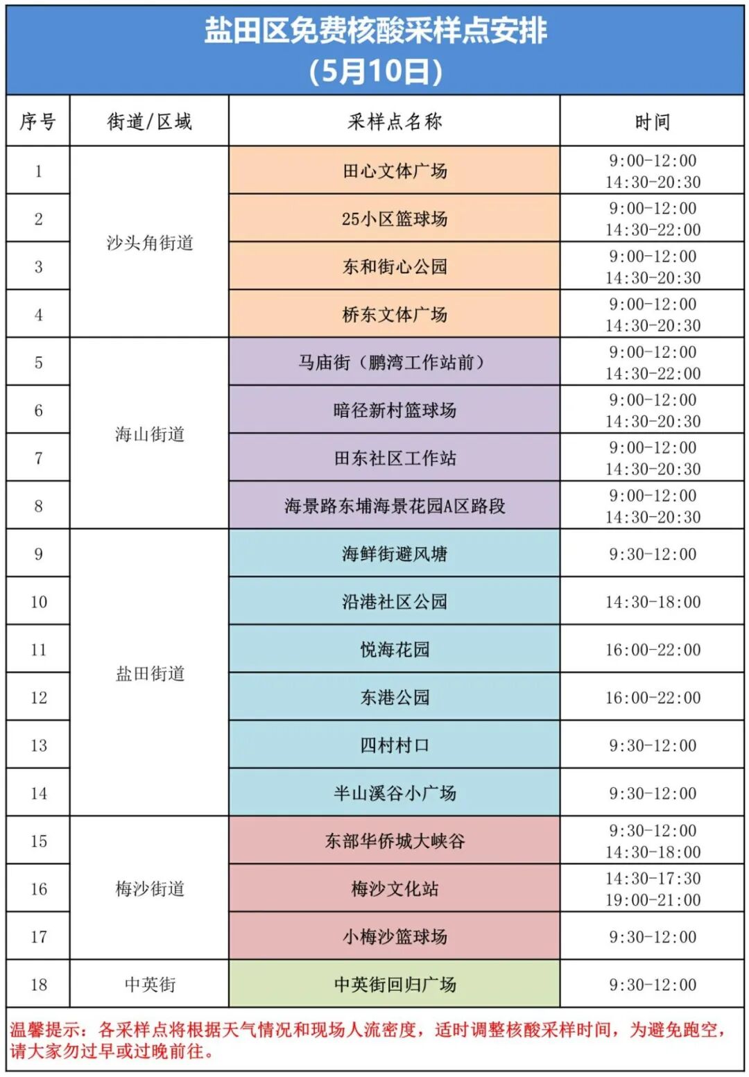 5月10日,盐田区免费核酸检测采样点安排如下: 温馨提示 请居民留意各采样点的服务提醒,去前先了解各采样点的服务人群范围,避免跑空跑错。 以上核酸检测点位数据来源于官微每日发布,可能会不开放或者临时调整,以点位现场实际情况为准。 前往采样时,请大家提前准备好,“粤康码”、行程码、身份证以备查验,请广大居民合理安排时间,戴好口罩前往就近核酸采样点检测,检测时别忘了与他人保持距离,不交谈,不扎堆。