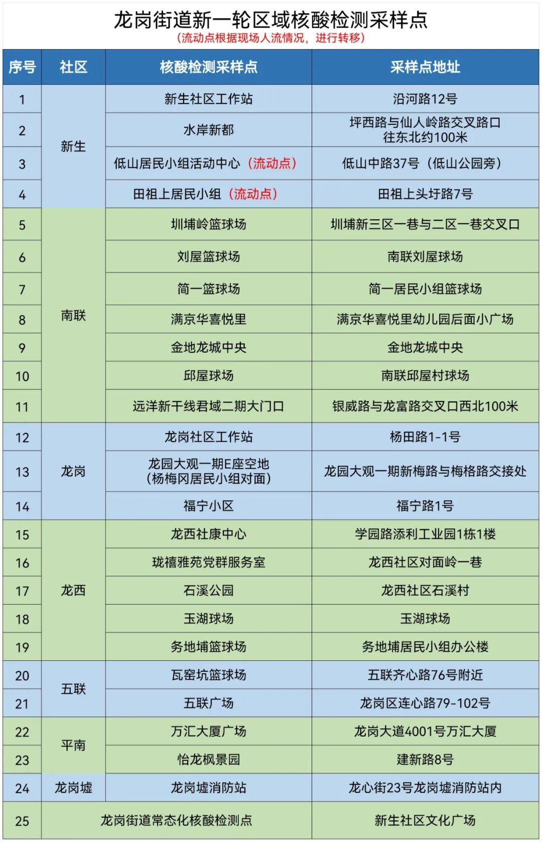 4.如在街道统一安排以外的时间有核酸检测需求,建议前往附近的公立医院(龙岗中心医院),全天24小时可采样。