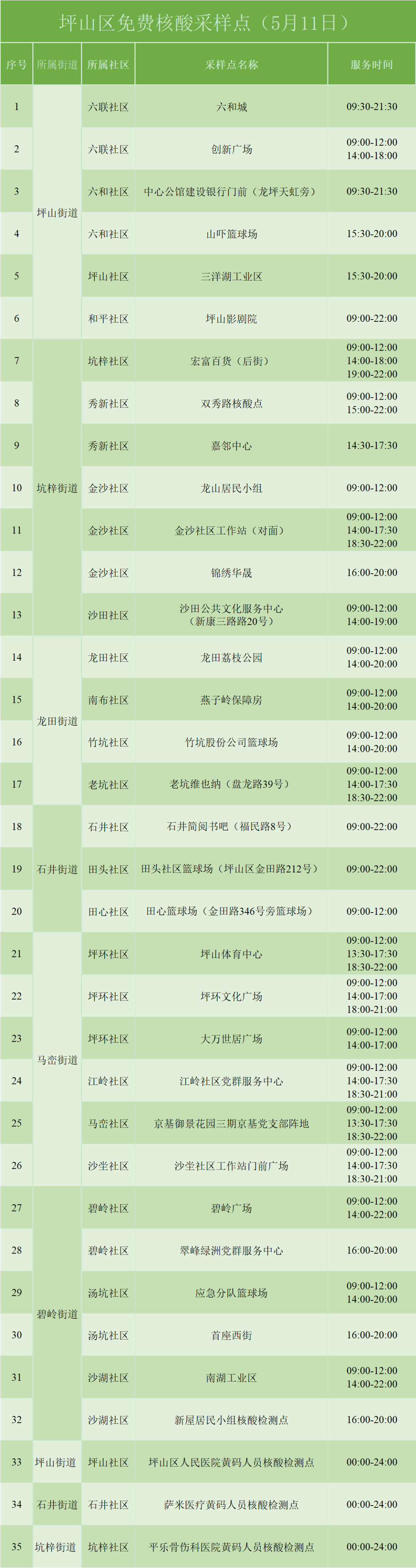 5月11日坪山免费核酸检测采样点安排
