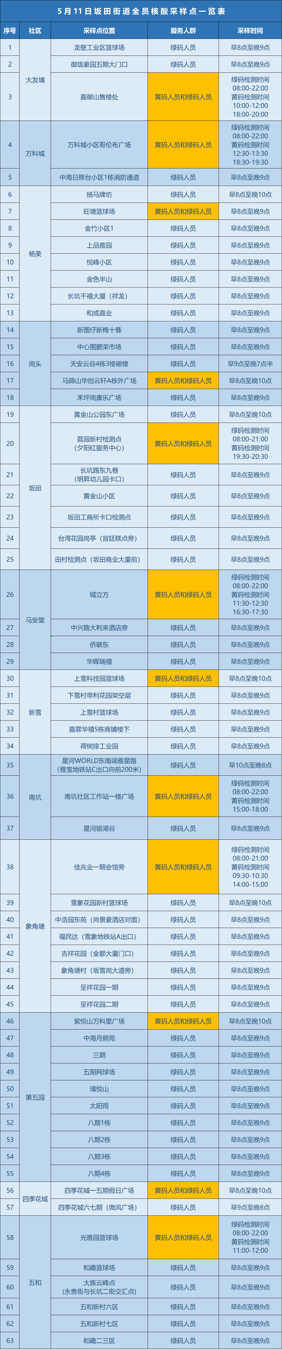 根据疫情防控工作需要,5月11日坂田街道全员核酸检测延长一天(48小时内曾接种新冠疫苗的居民朋友不采核酸),全街道设63个免费核酸采样点,请广大居民朋友根据指引,有序前往指定地点进行核酸采样检测。