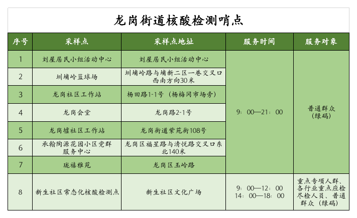 5月13日龙岗街道,设以下核酸检测点,请大家注意出行安全,就近就便前往。 注 意 1. 接种新冠疫苗48小时内,不能进行核酸检测; 2. 排队时请戴好口罩、保持一米距。 无新冠十大症状黄码人员,请到医院黄码采样点采样检测。 街道社区防疫工作根据现场人流密度,适时调整核酸采样时间,为避免跑空,请大家勿过早或过晚前往,切忌踩点。 以上核酸检测点位数据来源于官微每日发布,可能会不开放或者临时调整,以点位现场实际情况为准。