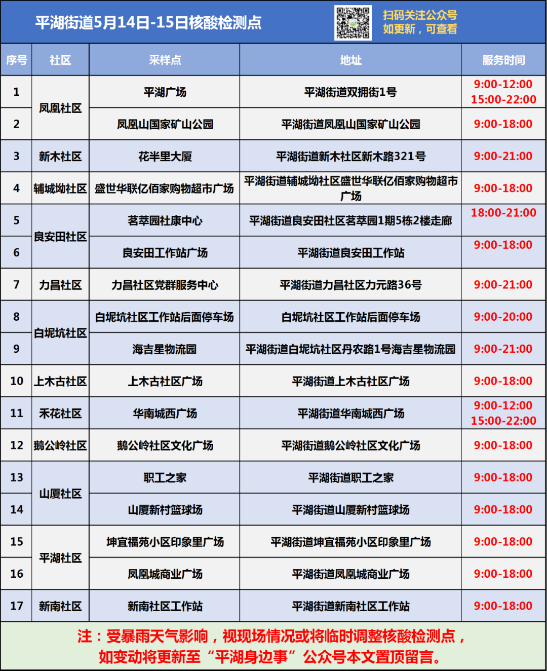 本周末(5月14-15日)平湖核酸点更新如下表 。