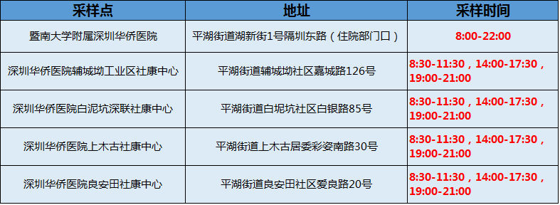 此外,深圳华侨医院及辅城坳、上木古、良安田、白坭坑社康中心的免费核酸检测服务恢复。