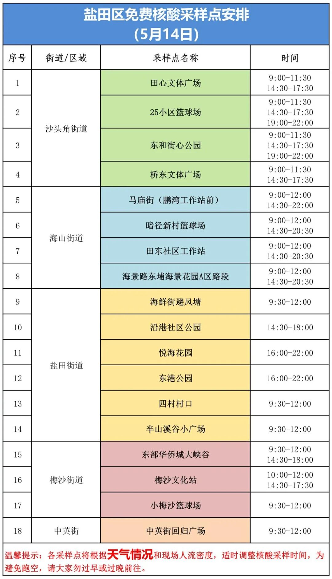 5月14日,盐田区免费核酸检测采样点: 温馨提示 请居民留意各核酸采样点的服务提醒,去前先了解各采样点的服务人群范围,避免跑空跑错。 前往采样时,请大家全程佩戴口罩,与他人保持1米以上间隔,扫场所码打卡,不交谈,不扎堆。 当前疫情防控形势依然严峻复杂,我们仍不能有丝毫松懈,请市民继续履行个人防控责任,做好戴口罩、勤洗手、多通风、勤消毒、保持社交距离等防护措施,主动配合落实各项疫情防控要求。
