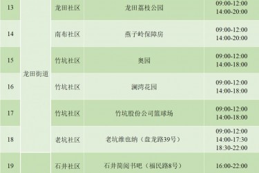 6月3日端午节(周五) 6月4日(周六) 6月5日(周日) | 新安街道分馆、西乡街道分馆 航城街道分馆、福永街道分馆 福海街道分馆、沙井街道分馆 新桥街道分馆、松岗街道分馆 燕罗街道分馆、石岩街道分馆 新安中洲分馆、新安兴东分馆 西乡流塘分馆、少儿分馆(1990分馆) | 9:00-17:00 |