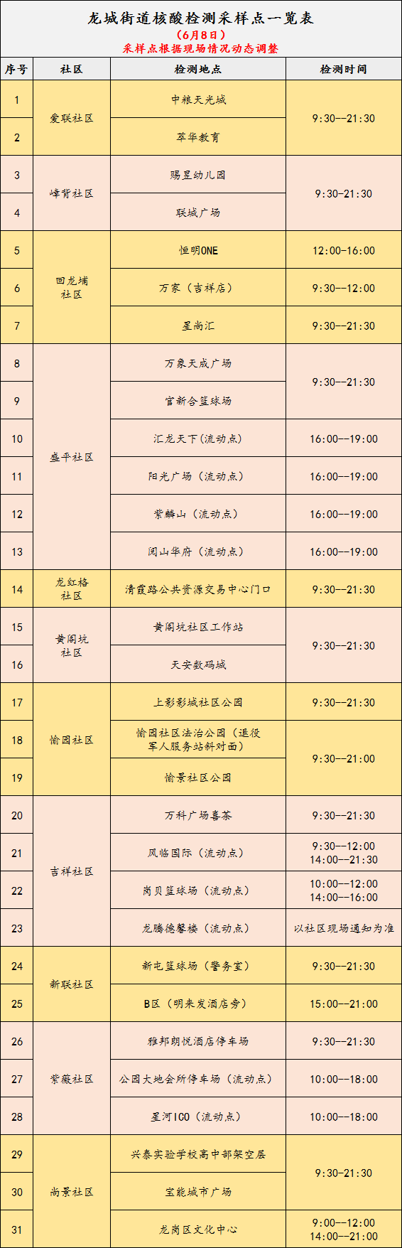 6月8日龙岗区龙城街道31个便民核酸检测采样点信息