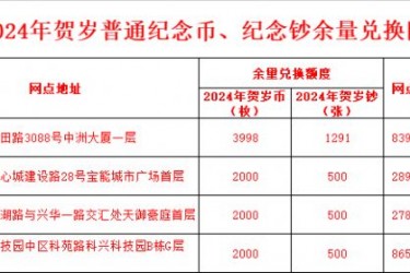 2024年贺岁币余量、2024年贺岁钞余量采取线上预约方式。线上预约通过我行线上渠道办理,预约期内先到先得,约满为止。具体预约兑换网点及额度等信息见下图。